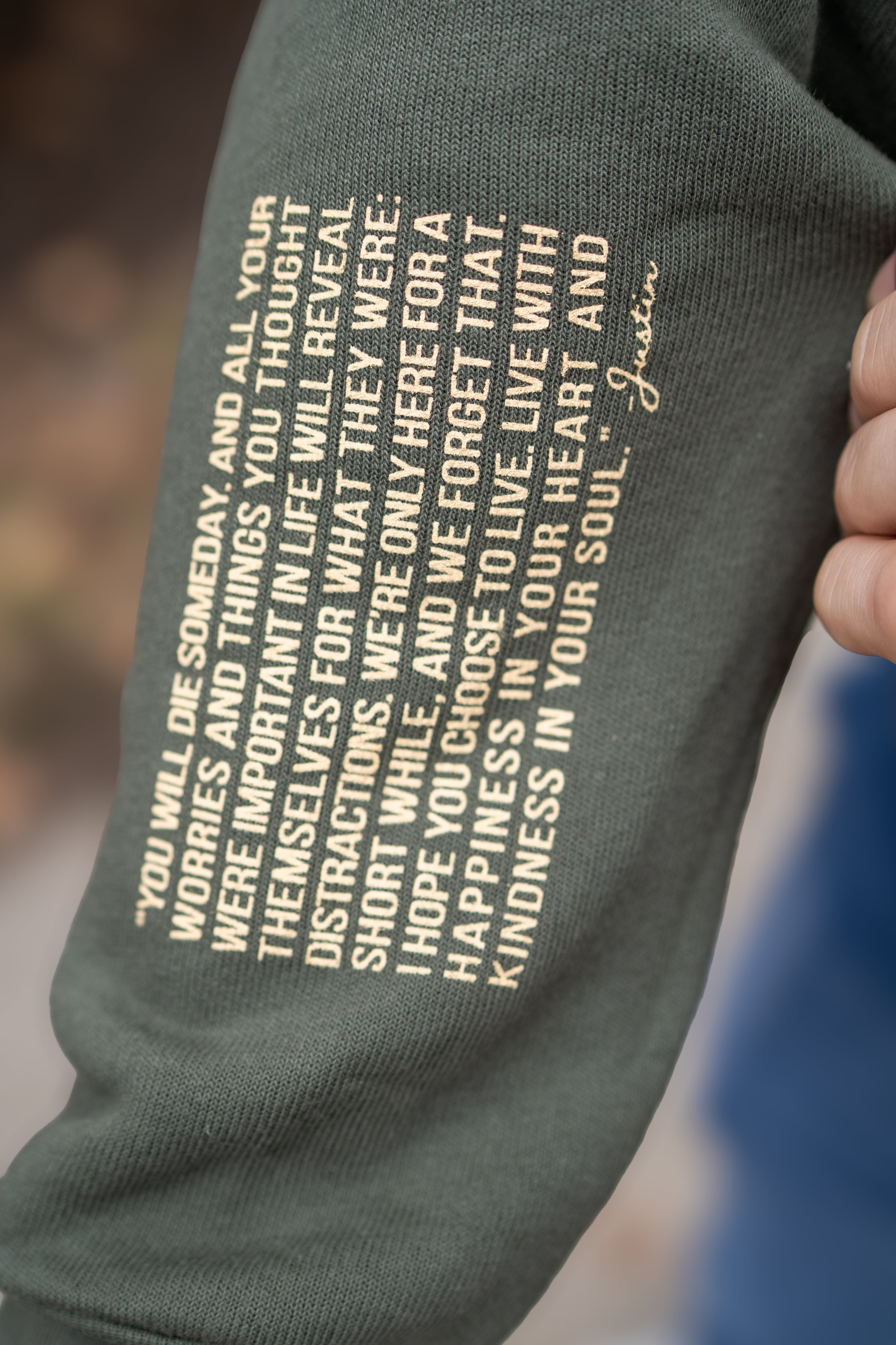 Across the back, Justin has written a dedication — reflecting on the memories and the people who made it all matter.