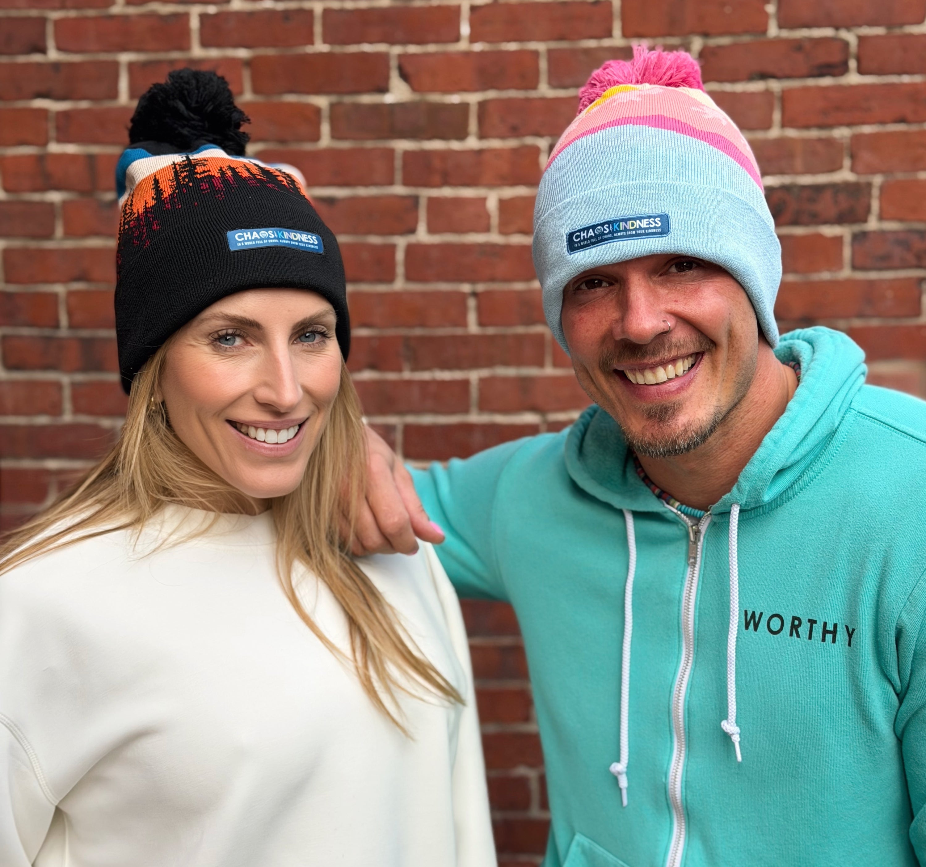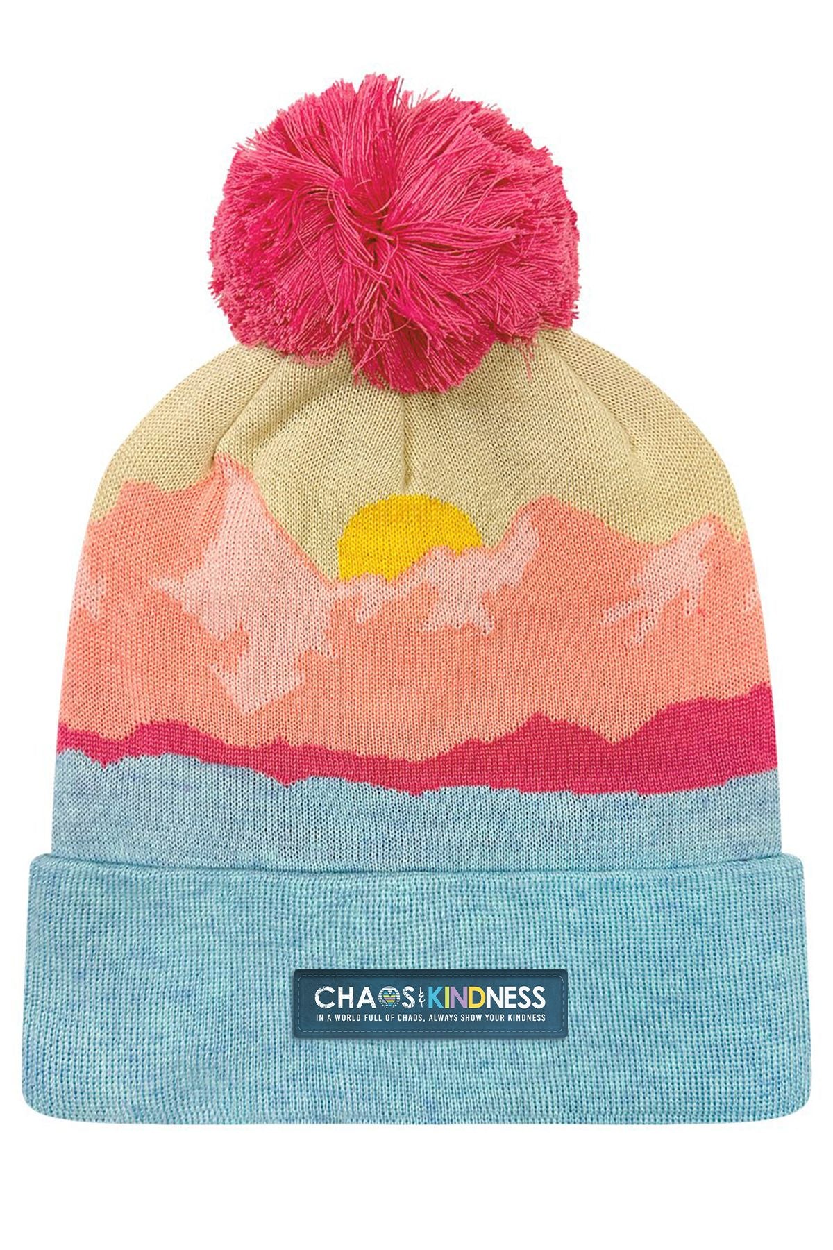 This cozy, soft knit beanie features a playful, textured pom-pom. The warm sunrise graphic peeks over a snowy mountain range, blending winter calm with a pop of optimism. The folded ribbed cuff carries a premium Chaos & Kindness patch — a simple reminder that even in the chilliest chaos, kindness still rises first.