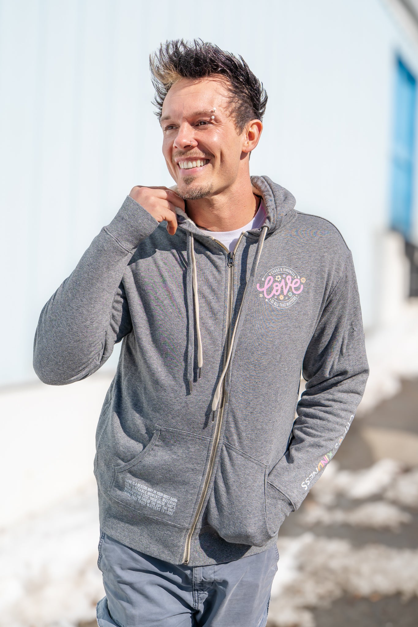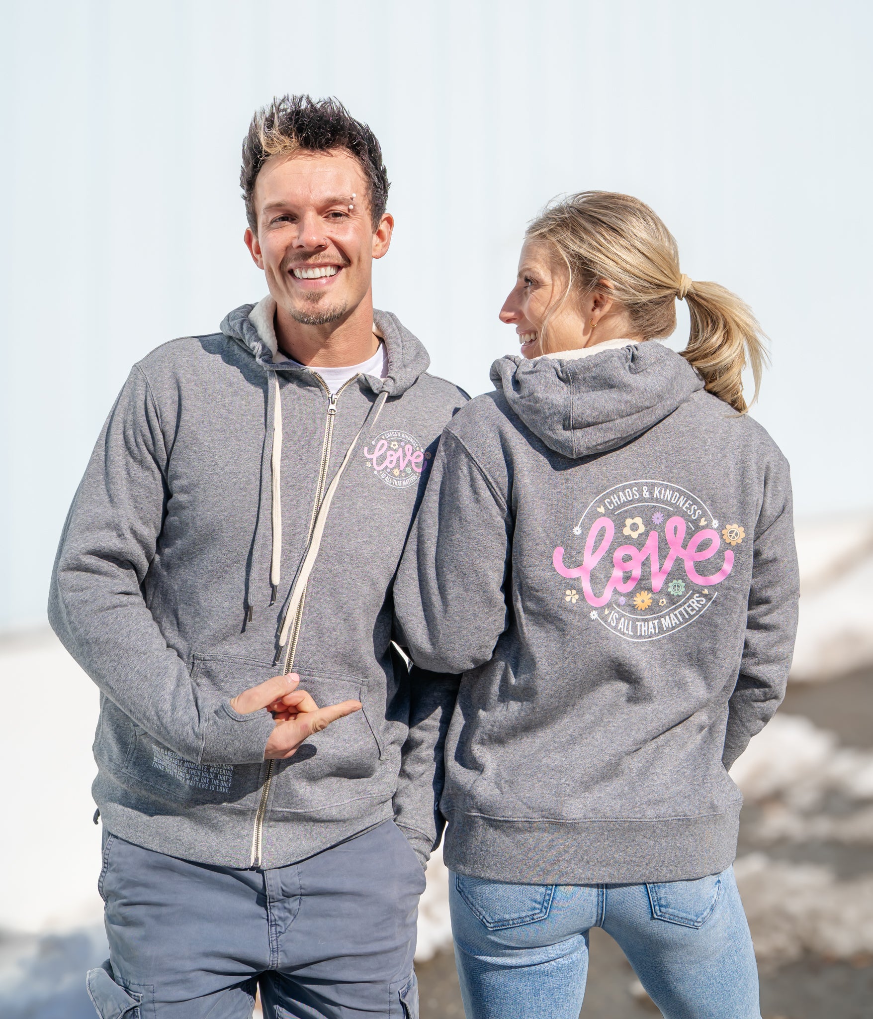Winter is still winter-ing so we've got you covered! This incredible zip hoodie is lined from top to bottom and left to right with the coziest sherpa. You can't go wrong on pairing this with joggers to just kick back on a cold night, or even layer it over jeans and boots for classic winter fashion. The design is one you've just seen a small taste of, on a recent mug — but look closely at the intricate design and beautiful messaging. It's fun, thoughtful, and the best reminder that LOVE is all that matters.
