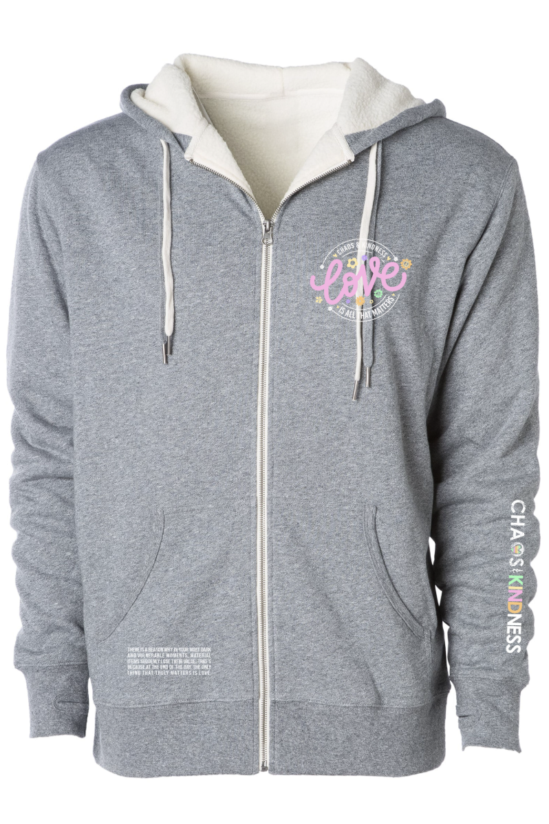 LOVE IS ALL THAT MATTERS SHERPA LINED HEAVYWEIGHT ZIP