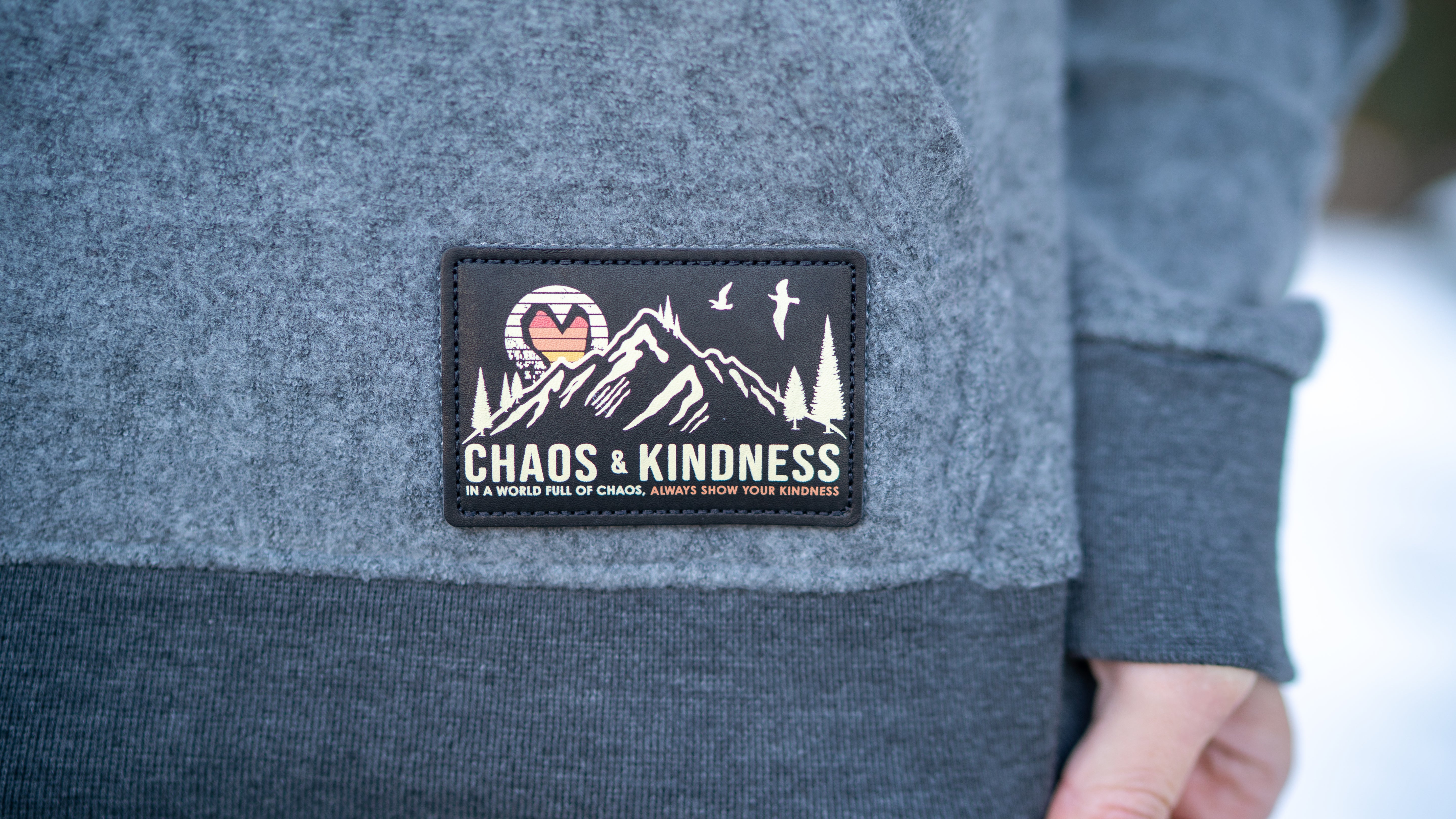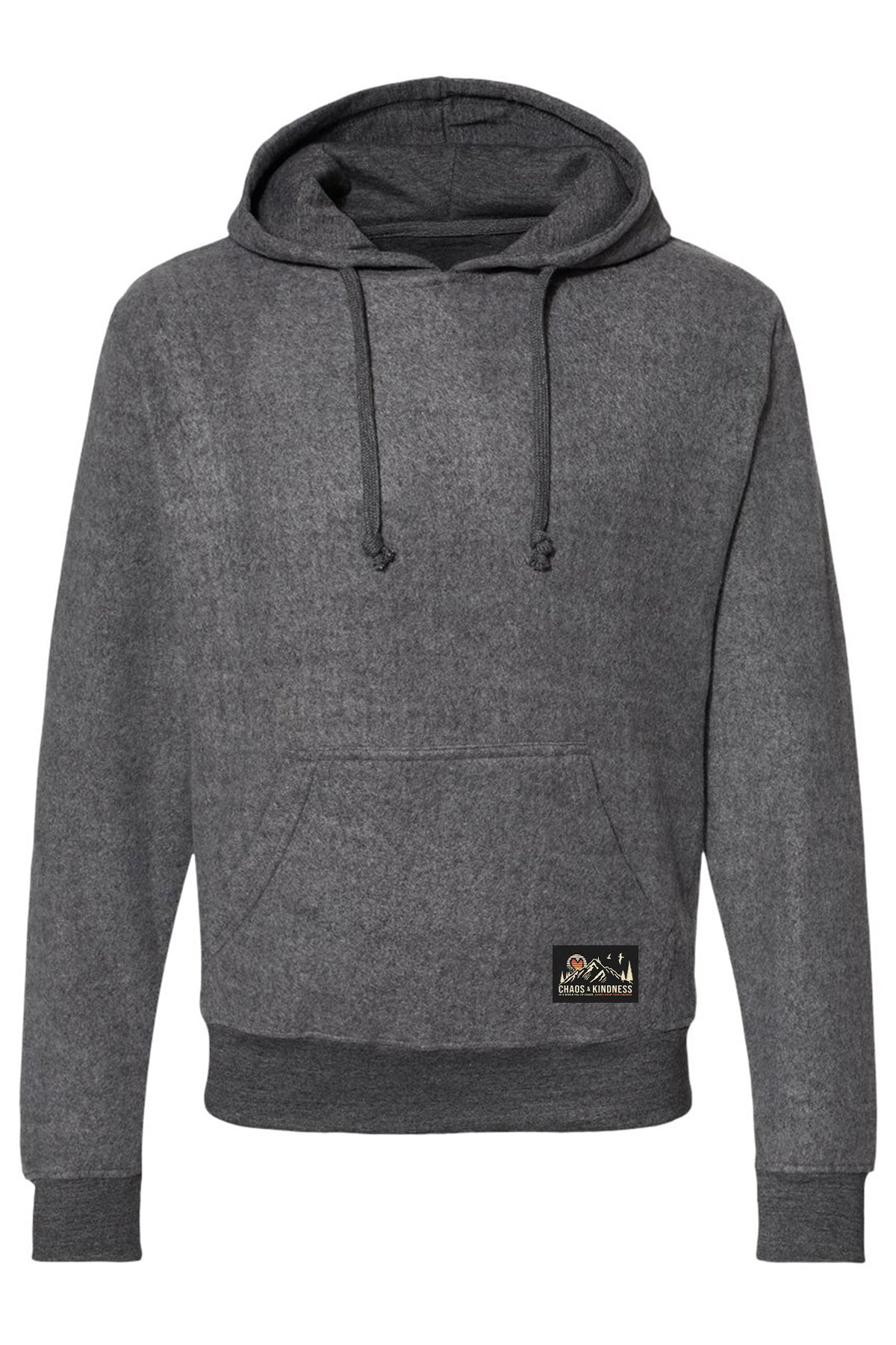 Meet the coziest curveball we’ve thrown yet: an inside-out, flip-side fleece that takes everything you love about comfort and strips it back to its cleanest, calmest form. No graphics. No noise. Just a beautifully soft, heathered fleece with matching drawcords and a perfectly placed black leather mountains patch — a quiet nod to the heart of Chaos & Kindness.