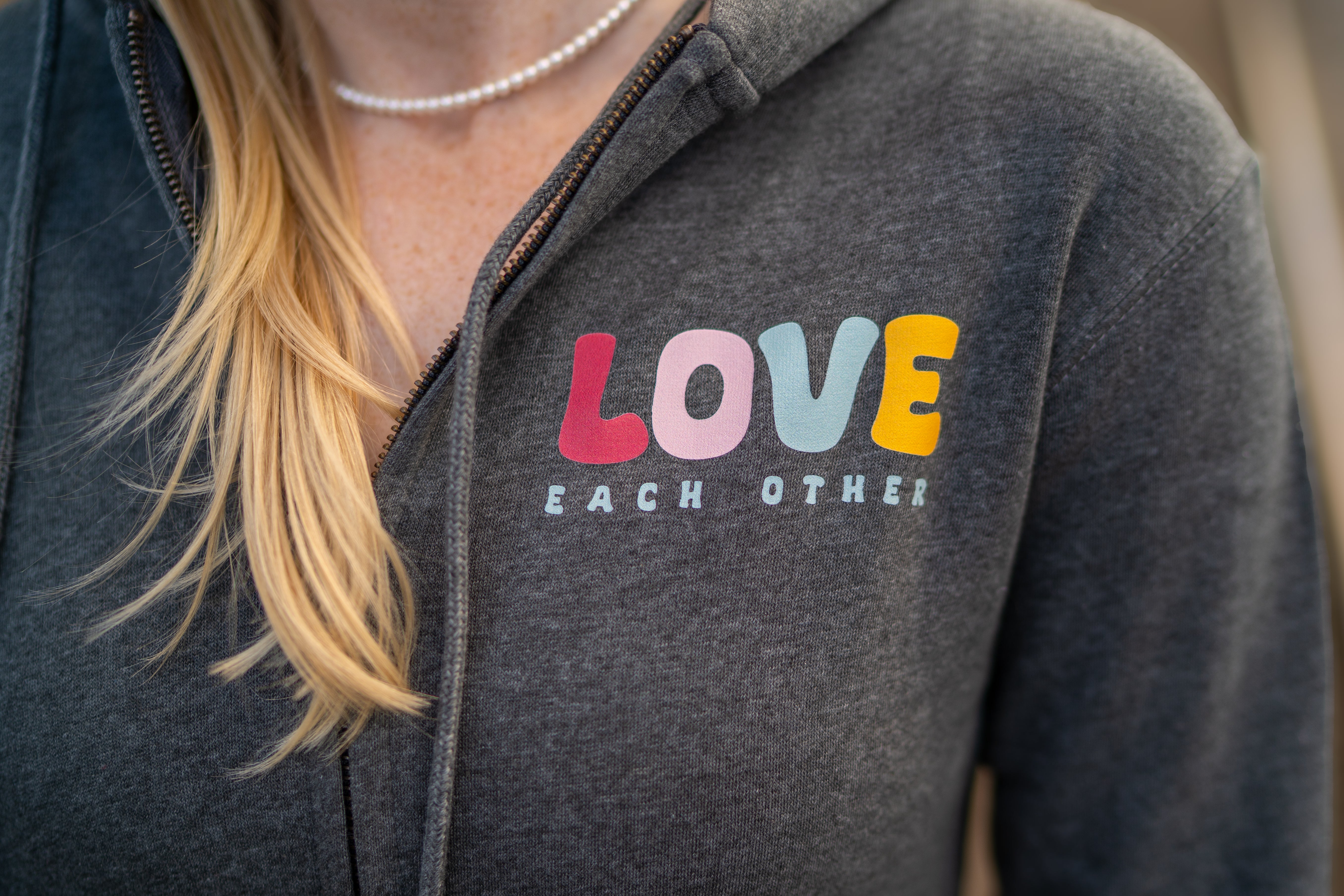Designed with a soft, vintage-charcoal base and dressed up with playful retro stripes down each sleeve, this piece blends comfort, character, and a whole lot of heart. The front chest features a Love Each Other message in sun-washed colors, while the sleeve cuff carries the CK heart mark — a quiet reminder of what really matters.