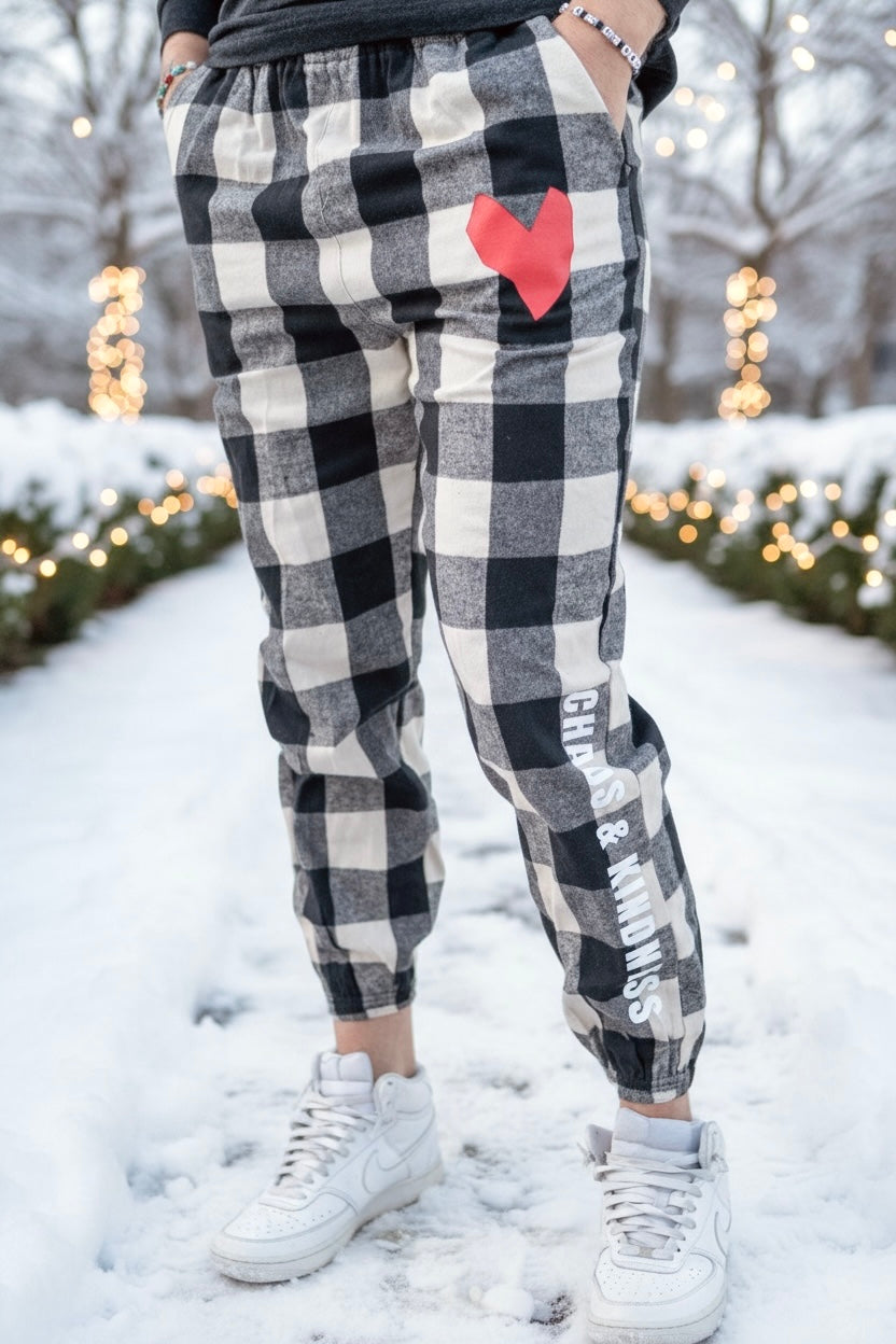 The Flannel Joggers bring the cozy home. With a timeless black-and-white plaid, jogger fit, and a pop of Chaos & Kindness love (hello heart detail), these bottoms are made for lounging, movie nights, and Christmas morning chaos. Finished with a relaxed waistband and cuffed ankles, they’re comfy enough for all-day wear — pajamas that don’t mind being seen.